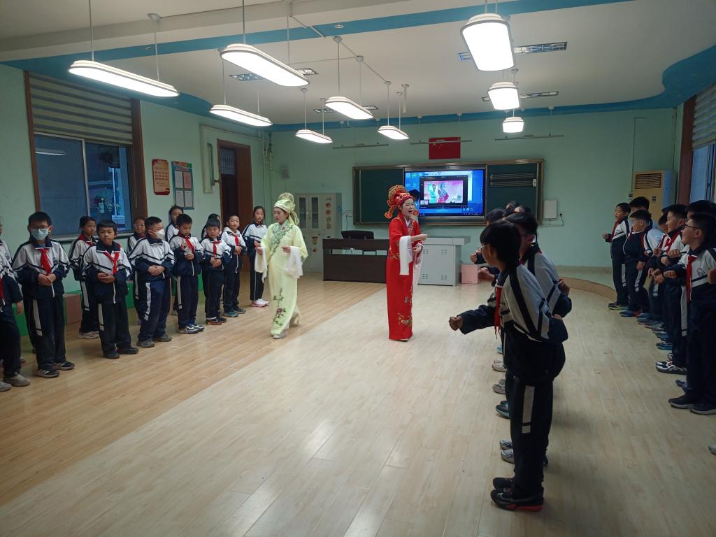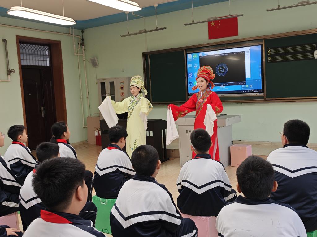 接下来社团成员杨延菊、王媛两位同学一起现场表演了五音戏经典剧目《赵美蓉观灯》的精彩片段。演员们身着靓丽精致的戏服,以清亮婉转的唱腔、舒展优美的身段,将剧中热闹喜庆的观灯场景演绎得惟妙惟肖。水袖轻扬间流转着五音戏的独特韵味,细腻的表情和到位的动作瞬间点燃现场气氛,赢得了孩子们的阵阵喝彩,让他们近距离感受到传统戏曲的艺术感染力。